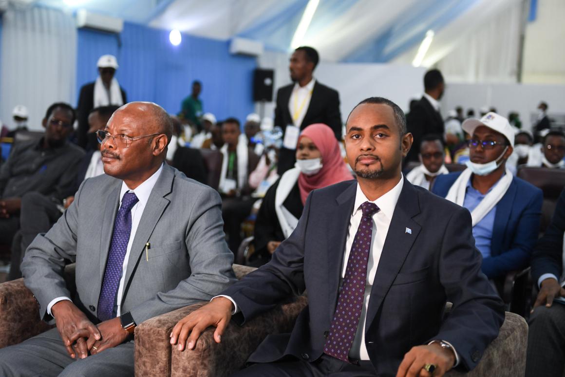 The United Nations Secretary-General's Deputy Special Representative for Somalia, Adam Abdelmoula, and Somalia's Federal Minister of Justice and Judicial Affairs, Abdulkadir Mohamed Nur, at a ceremony to commemorate the International Anti-Corruption Day in Mogadishu, Somalia on 9 December 2021.