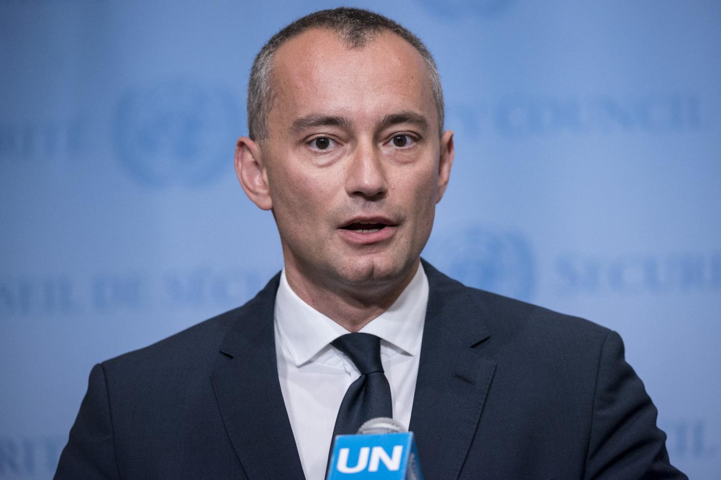 Nickolay Mladenov, UN Special Coordinator speaks to journalists following Security Council debate on sit in Middle East including the Palestinians question - 20 April 2017 - UN Photo / Rick Bajornas