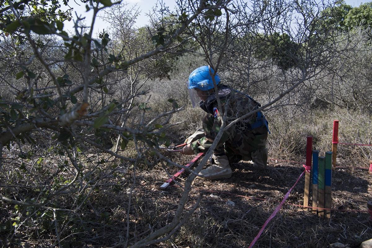 A UNIFIL Cambodian de-miner carefully clears vegetation in a mine risk area near Rmeish. Peacekeeping is not just about patrolling and reconnaissance missions. It also means working to create a condition whereby the residents…