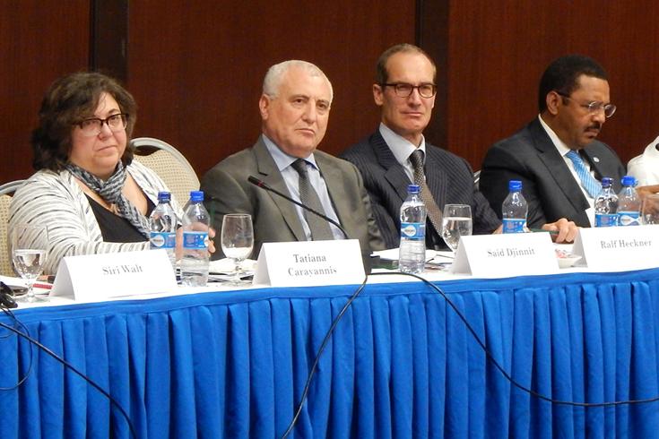 From left to right: Siri Walt (Swiss Ambassador to the Democratic Republic of Congo); Tatiana Carayannis (Conflict Prevention and Peace Forum); Said Djinnit (UN Special Envoy for the Great Lakes region); Ralf Heckner (Swiss Ambassador for Kenya, Rwanda, Burundi, Uganda and Somalia); Mamadou Diallo (Deputy Special Representative of the UN Secretary-General for the DRC); and Laurence Wohlers (United States Special Representative for the Great Lakes Region of Africa) (Ph. Penangnini Toure)