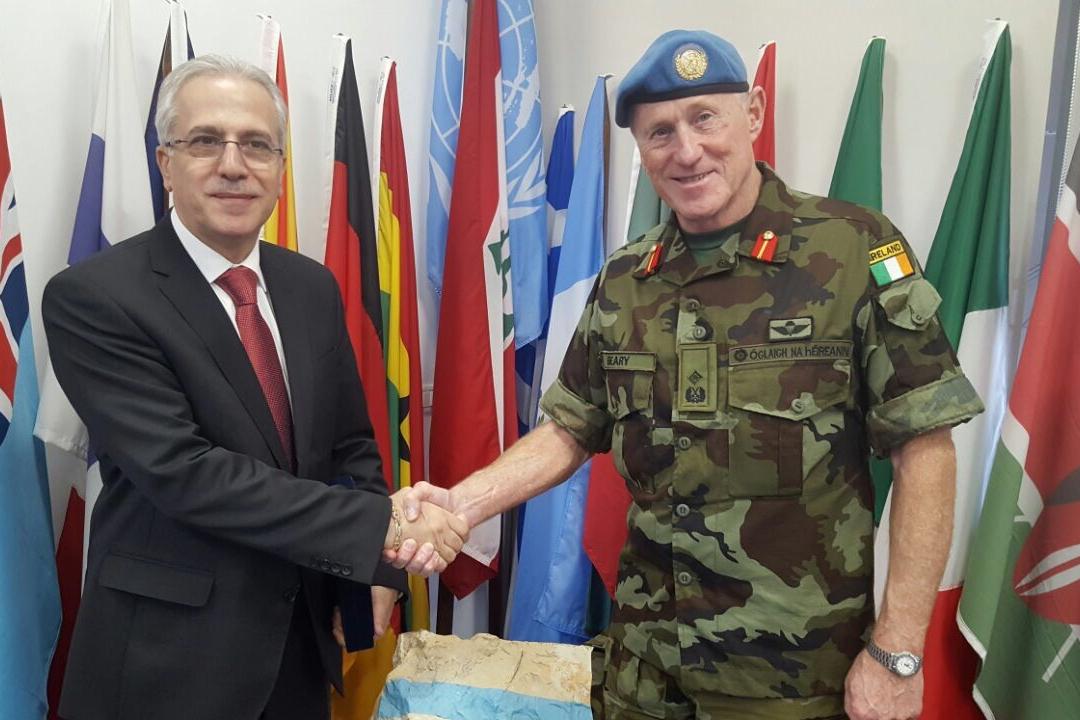 During the visit of a Lebanese Civil Defense delegation led by its General Director, Brigadier General Raymond Khattar (left), to the UNIFIL Headquarters on 13 February, he also met with UNIFIL Head of Mission and Force Commander Major General Michael Beary.