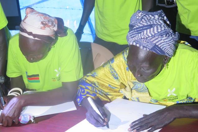 Participants in the peace process signing the peace agreement between Murle and Dinka communities.