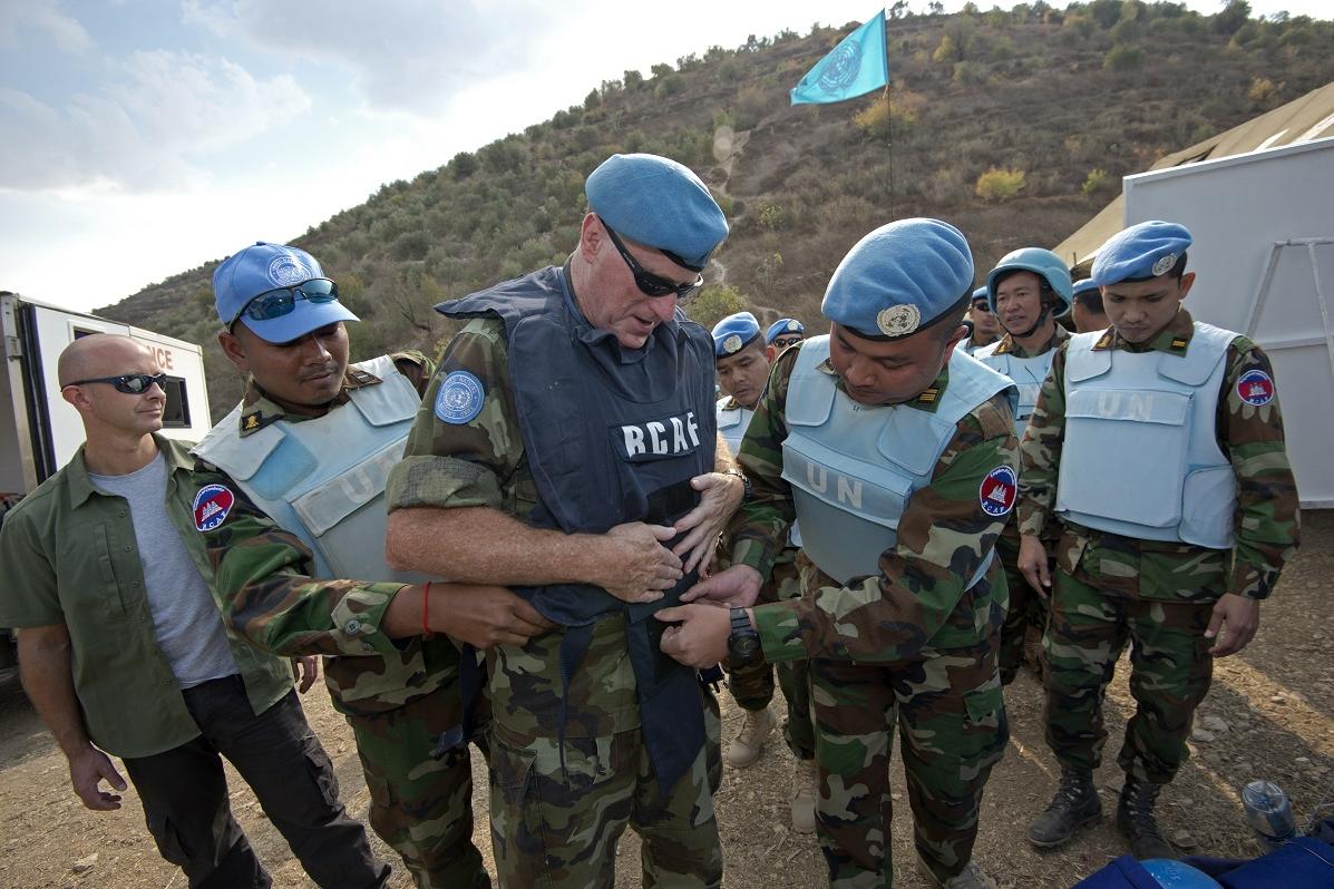 UNIFIL’s Head of Mission and Force Commander, Major-General Michael Beary, puts on personnel protective equipment before walking the cleared path to a new Blue Line point in the vicinity of Blida.