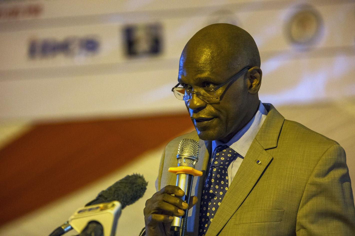 The Deputy Special Representative of the United Nations Secretary-General (DSRSG) for Somalia, Peter de Clercq (middle), the UNOCHA Head of Office for Somalia, Justin Brady (right), and the FAO Head of Programmes, Rudi Van Aaken (left), attend a media briefing to launch the latest Food Security and Nutrition Situation Update for Somalia, on 20 September 2016 in Mogadishu. UN Photo