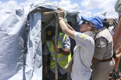 UN Police assisting to dismantle displaced people’s tents at UNMISS Juba Tomping base on 17 March for relocation to UN House and better shelter from rains. Photo: UNMISS/Isaac Billy