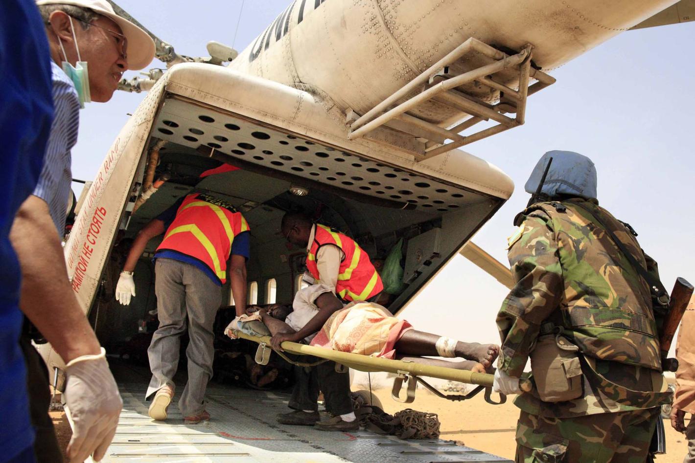 UNAMID officers airlift one of the 37 wounded civilians. Photo by Rania Abdulrahman. El Fasher, 25 February 2013 - On 24 February 2013 in North Darfur, the African Union - United Nations Mission in Darfur (UNAMID) airlifted…