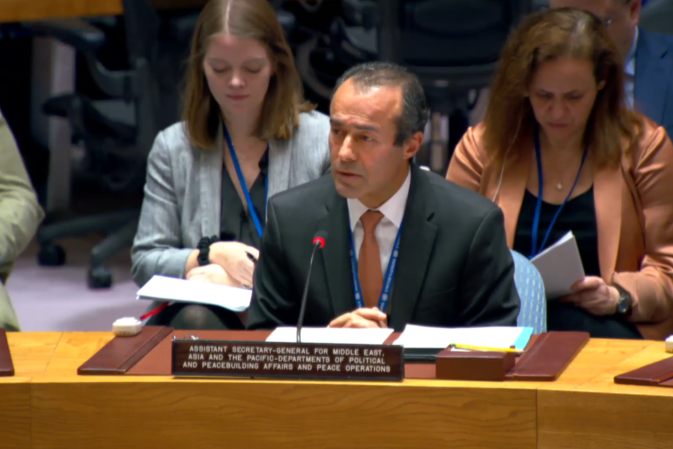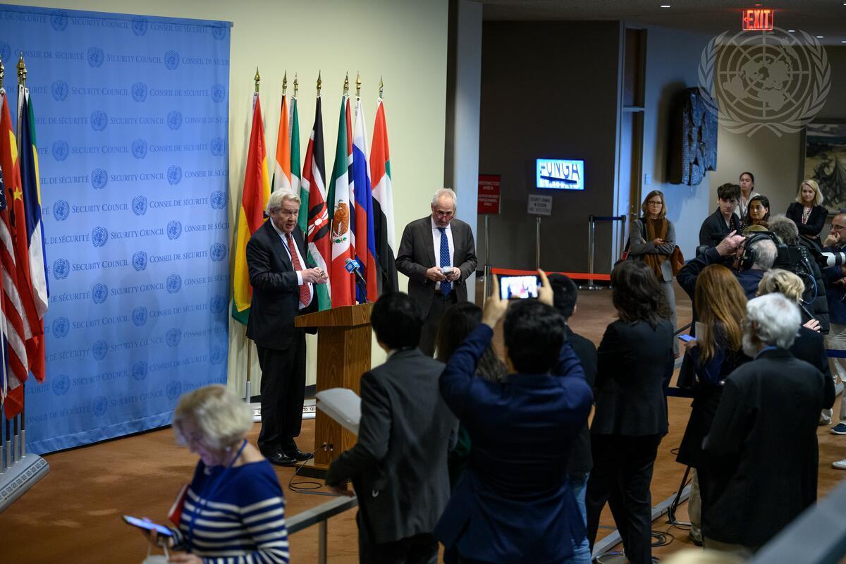 Tor Wennesland (at podium), UN Special Coordinator for the Middle East Peace Process, briefs reporters after the Security Council meeting on the situation in the Middle East, including the Palestinian question. (UN Photo/Loey Felipe - 22 November 2022)
