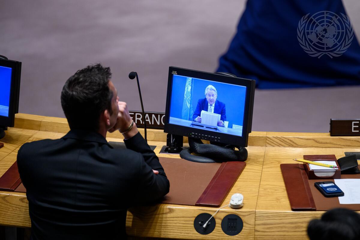 On screen, UN Special Coordinator for the Middle East Peace Process, Tor Wennesland, briefs the Security Council from Jerusalem on the Situation in the Middle East, including the Palestinian Question [UN Photo/Loey Felipe - 18 January 2023]