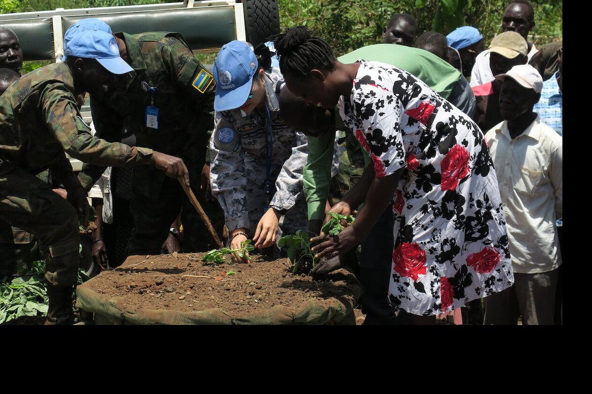 Women and men in Juba's Korok West Village, guided by UNMISS peacekeepers from Rwanda, plant vegetables and learn how to use fuel-efficient stove. Photos: Moses Pasi/UNMISS