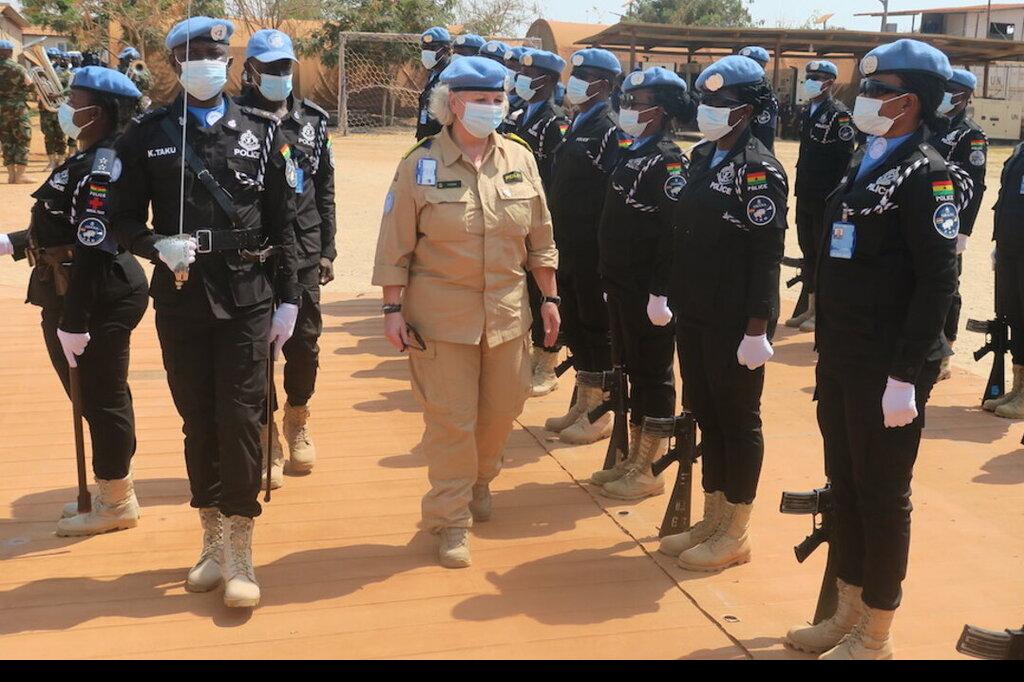 On a field visit to Bentiu, UNMISS Police Commissioner Christine Fossen was treated to a guard of honour by Ghanaian colleagues. Photo: Jacob Ruai/UNMISS