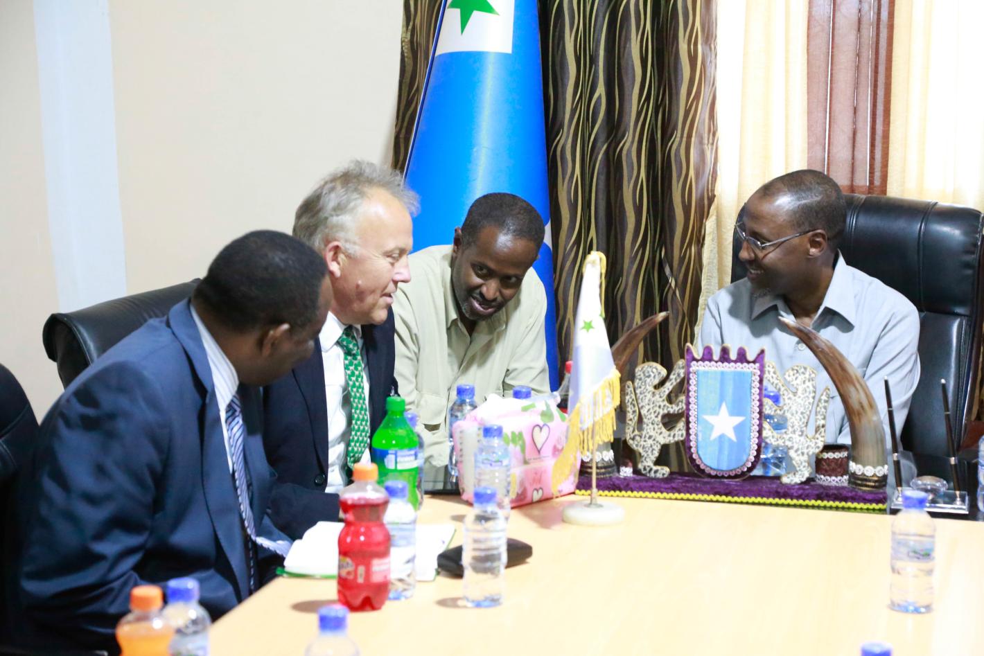 The Special Representative of the UN Secretary-General (SRSG) for Somalia, Michael Keating and the Special Representative of the Chairperson of the African Union Commission (SRCC) for Somalia, Ambassador Francisco Caetano Madeira in a discussion with the President of Galmudug State, Abdikarim Hussein Guled during a visit to assess the ongoing electoral process in Galmudug State, on 26 November 2016