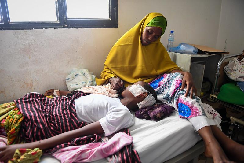 What they hear and see can be bracing. Shown here, a mother cares for her 11-year-old child who was wounded by shrapnel in a mortar attack in Laascaanood.