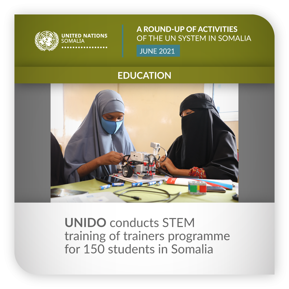 ![]() | Education | UNIDO Somalia conducts STEM training of trainers programme for 150 students in Somalia From 13th to 17th June 2021, UNIDO in Somalia, through funding contribution by the Italian Agency for Development Cooperation, has worked with HANO Academy and Somali STEM Society to conduct a Science, Technology, Engineering and Mathematics (STEM) Training program in Mogadishu for 150 university students from local universities. STEM Education in Somalia is critical to enhance access to quality training, strengthen productive capacities, resulting into a tangible opportunity to empower young Somali women and men through transformative skills that help stimulate creative thinking and more dynamic problem-solving. | |
