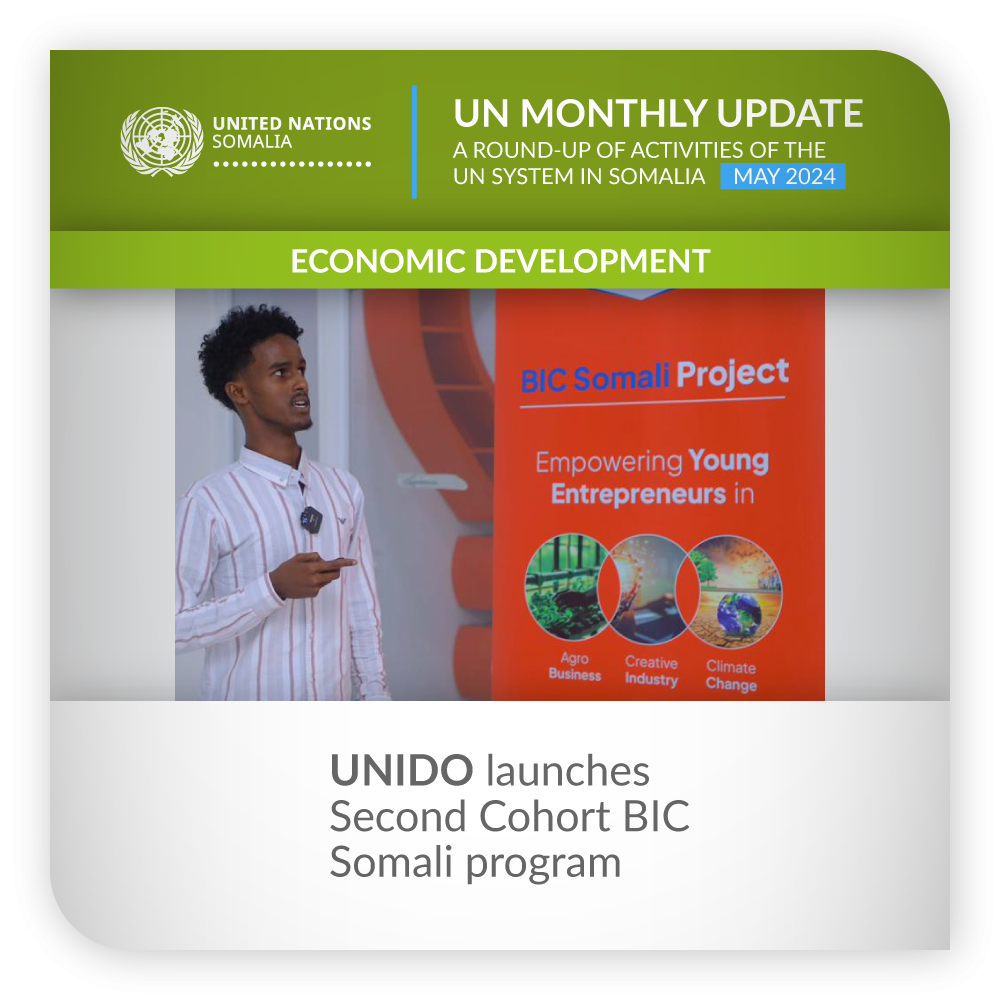 ![]() | Economic Development | UNIDO launches Second Cohort BIC Somali program UNIDO Somalia launched the Second Cohort BIC Somali program, funded by the EU, providing training and business pitch opportunities for 180 candidates in Mogadishu and Hargeisa. Additionally, UNIDO, in collaboration with the Chamber of Commerce, launched the First Cohort Somali EDUs Satellite program, establishing satellite incubation centres with training and business development opportunities for 30 entrepreneurs in Baidoa, Kismayo, and Bosaso. These initiatives empower Somali entrepreneurs and foster business growth across the country. | |
