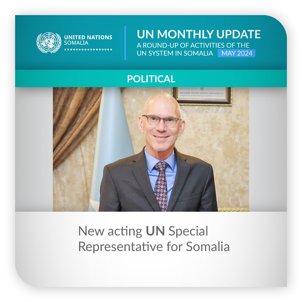 ![]() | Political | New acting UN Special Representative for Somalia The Acting Special Representative of the UN Secretary-General for Somalia and Head of the UN Assistance Mission for Somalia (UNSOM), James Swan, arrived in Mogadishu on 26 May. Mr. Swan’s focus will be to support the Federal Government of Somalia and the Somali people to advance their peace, security, development, and state-building priorities. UN Secretary-General António Guterres announced his designation of Mr. Swan on 14 May. Mr. Swan previously served as the UN Secretary-General’s Special Representative for Somalia and Head of UNSOM from 2019 to 2022, after a long career in the United States diplomatic service. |