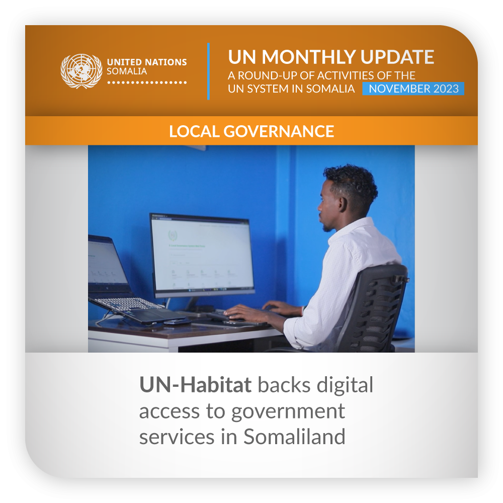 ![]() | Local governance | UN-Habitat backs digital access to government services in Somaliland UN-Habitat supported the Somaliland Ministry of Information and Communication Technology to develop and launch an innovative e-governance platform – a mobile application and web portal where locals can access local government services and pay taxes, fees and other charges. The user-friendly smartphone application, available for both Android and iOS users, serves as a hub for residents to access and receive a wide range of municipal services – including registering property, land and business permits, among others. Alongside the mobile app, a comprehensive web portal (www.govsomaliland.online) offers further accessibility to these services, catering to a broader spectrum of users across five districts of Somaliland: Hargeisa, Borama, Berbera, Burao, and Gabiley. | |
