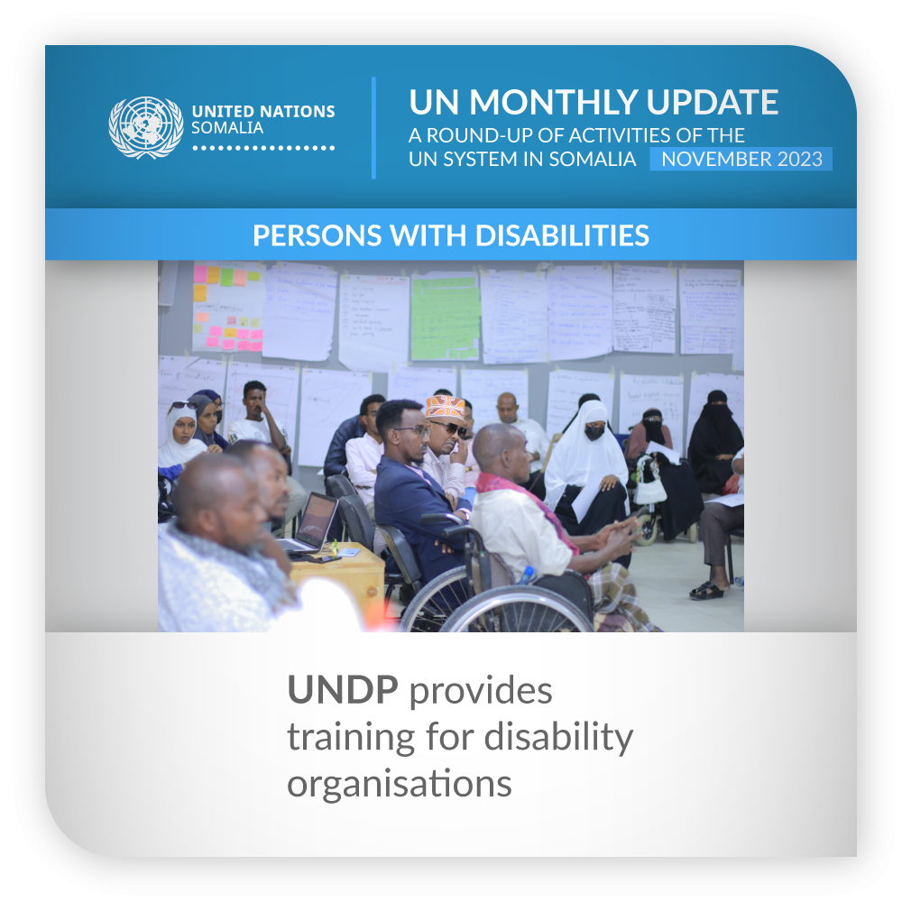 ![]() | Persons with disabilities | UNDP provides training for disability organisations UNDP organised a capacity-building workshop to empower organisations representing persons with disabilities in Puntland. The three-week training programme, specifically tailored for disability organisations, was conducted in Garowe, the Federal Member State’s capital, and had a primary focus on strengthening skills and fostering awareness within these organisations. The training aimed to equip participants with essential skills, knowledge, and strategies to address the unique challenges faced by persons with disabilities. Additionally, a four-day media capacity-building session focused on advocacy for disability rights and creating inclusive content. | |