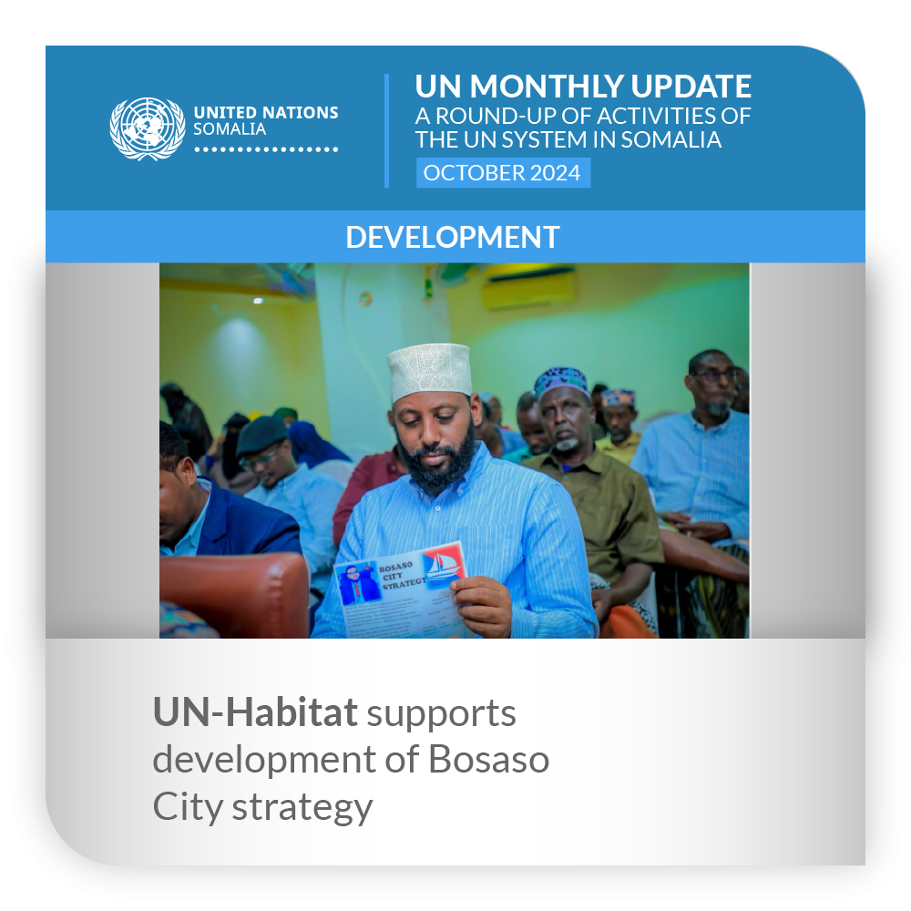 ![]() | Development | UN-Habitat supports development of Bosaso City strategy In partnership with IOM and UNDP, UN-Habitat supported the Bosaso Municipality to develop and launch the Five-year Bosaso City Development Strategy, covering from 2024 to 2029. Bosaso is now the second city in Somalia, after Baidoa, which the programme has supported in coming up with an evidence-based document to help guide rapid urbanization and locally-agreed priorities that have been aligned with national and state priorities. The document outlines the city’s strategic direction in addressing land management, improved mobility and transport for better accessibility and connectivity, service delivery, job creation and durable solutions that involve integrating displaced communities. UN-Habitat noted that these city strategies are developed following a consultative process to ensure local ownership. | |