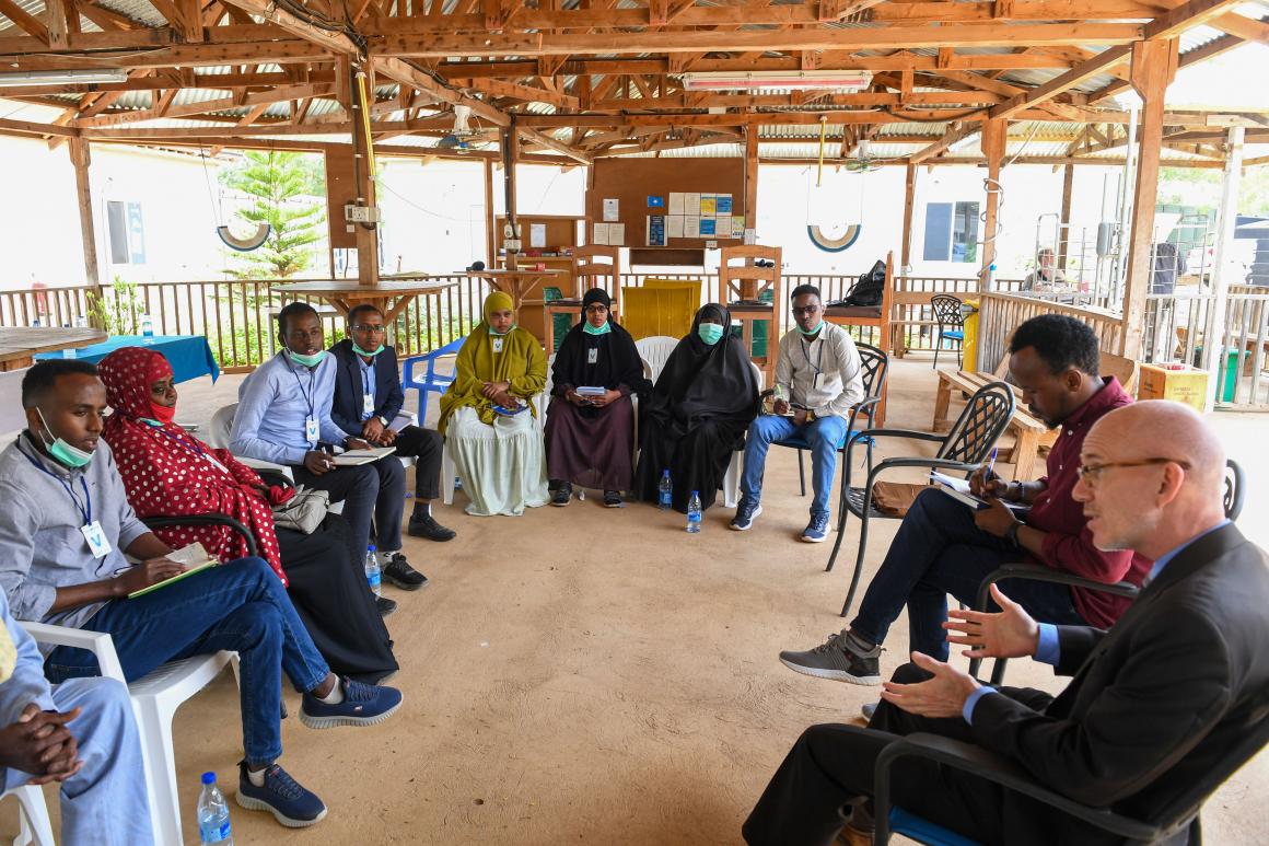 On his visit to Baidoa, the UN Special Representative was accompanied by the Chief of Mission of the International Organisation for Migration (IOM) in Somalia, Frantz Celestin, and the deputy head of the Office of the UN High Commissioner for Refugees (UNHCR), Sanaa Omer. The trio met with representatives of various local civil society groups, including the Bay Women Association Network (BWN), the Allamagan Relief and Rehabilitation for Disabled People Organization, the Somali South West Non-State Actors (SOSWENSA) and the South West Youth Vision.